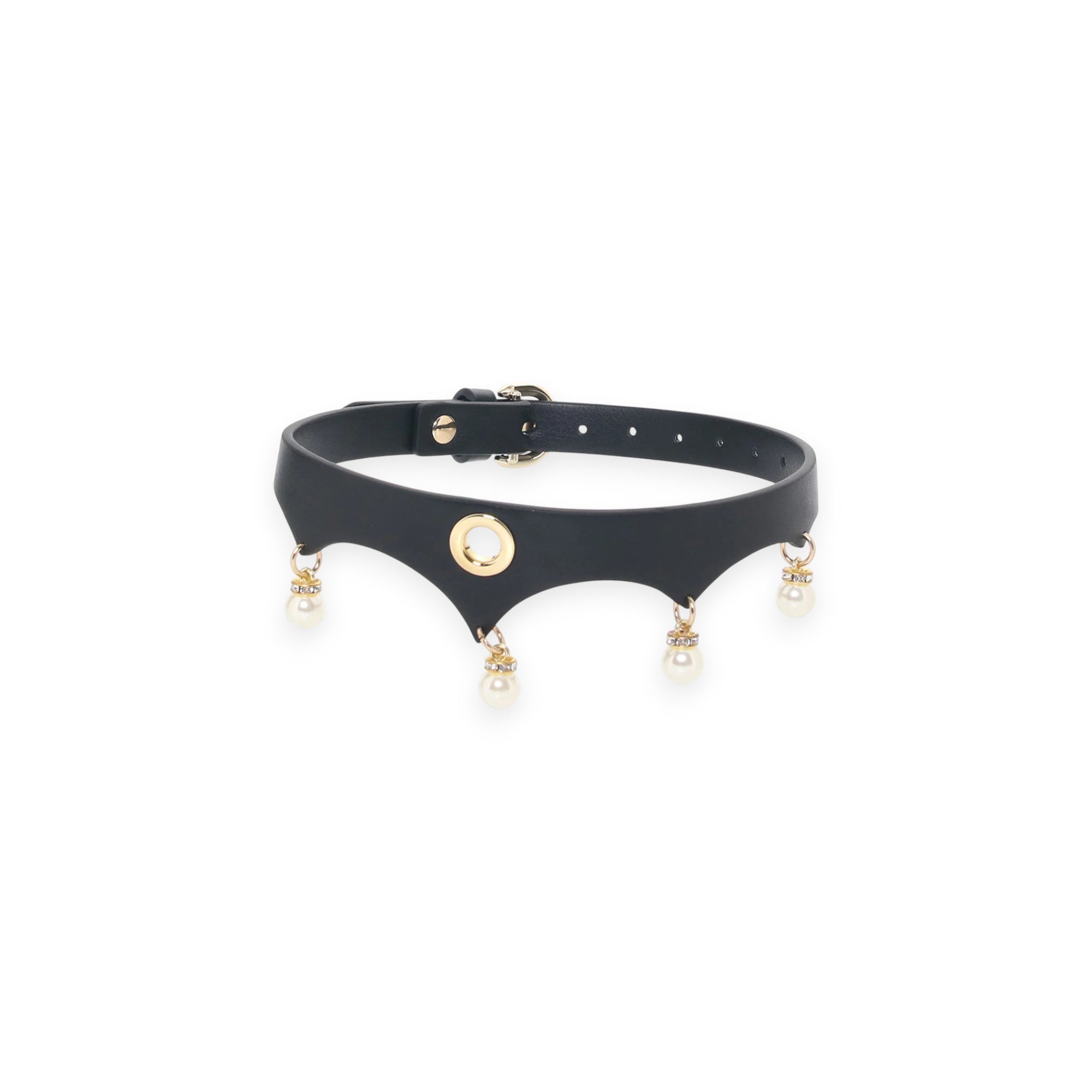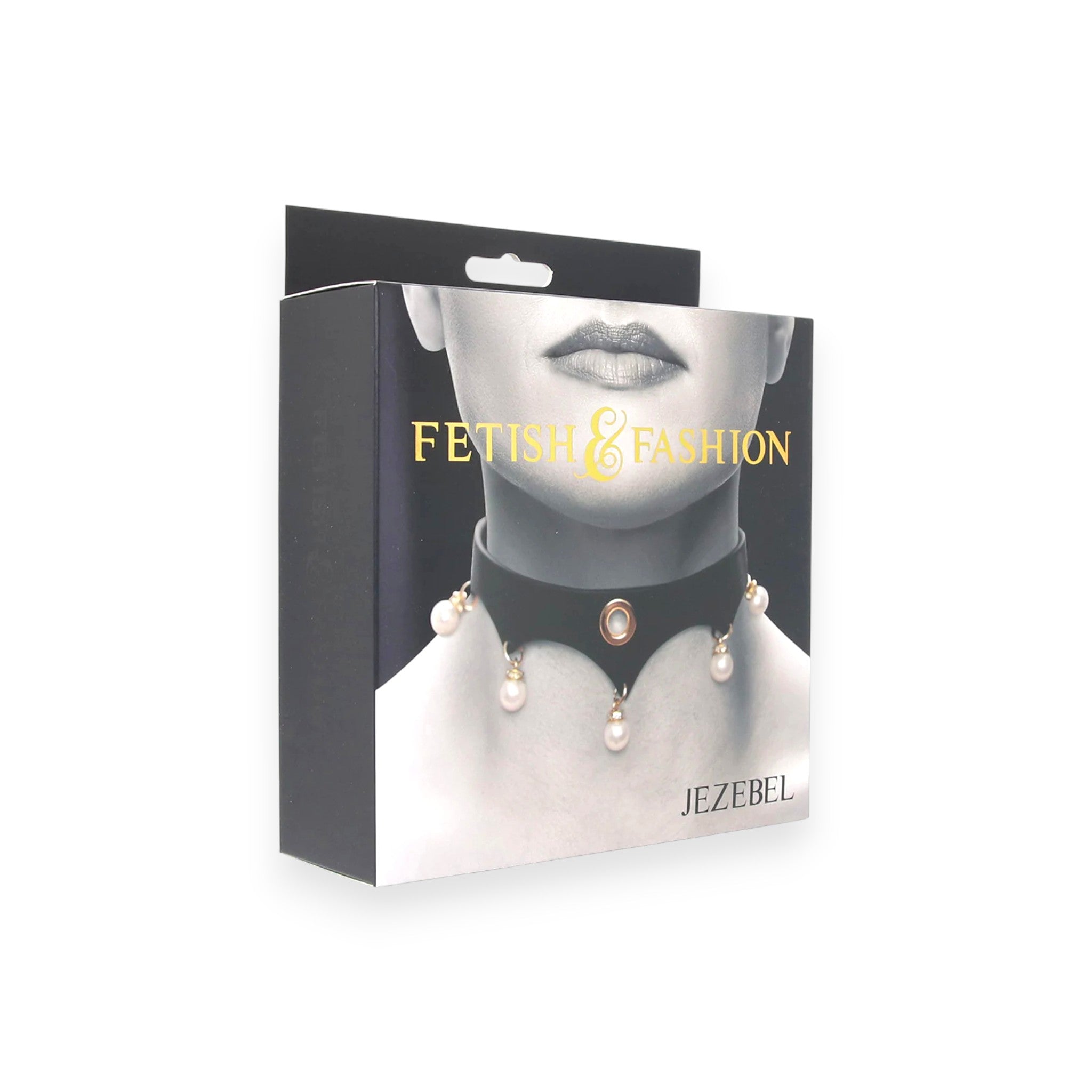 The Jezebel Collar from Fetish & Fashion combines bondage flair with fashion. Featuring pointed accents and dangling pearls, it fastens with an adjustable buckle and includes a subtle ring for leashes or harnesses.