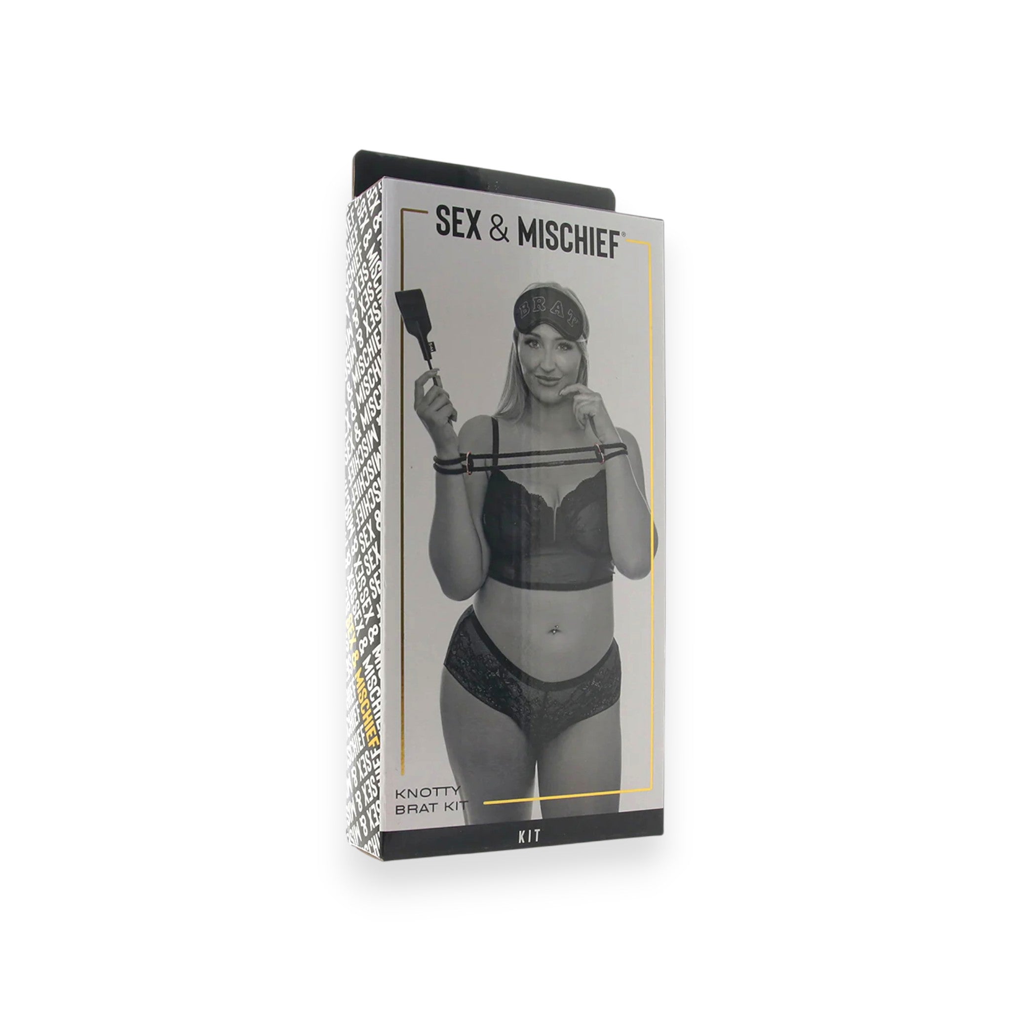 The Knotty Brat Kit from Sex & Mischief brings playful bondage to your bedroom. This starter set includes an adjustable rope cuff, a silky satin blindfold, and a mini leather crop with serious sting. Use individually or combine for a fully customized scene. Spot clean as needed.